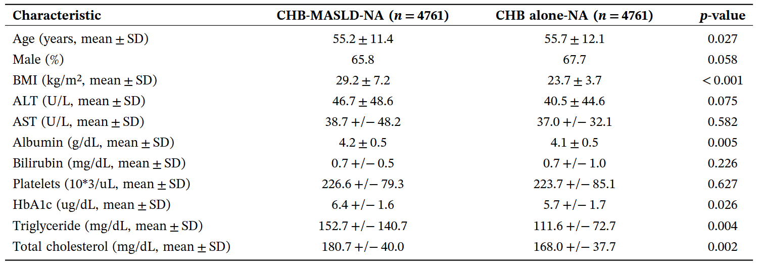 PSM后的TriNetX基线数据显示,尽管两组在肝脏生化指标及基础背景上基本均衡,但相比于无MASLD的慢乙肝患者,合并MASLD组的BMI、甘油三酯、总胆固醇以及糖化血红蛋白(HbA1c)水平显著更高。