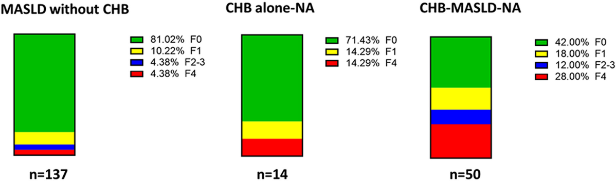 图2 临床队列中单纯MASLD、单纯慢乙肝及慢乙肝合并MASLD患者的肝纤维化分期分布