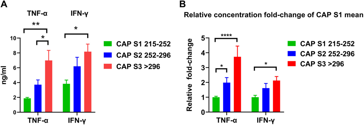 A:TNF-α和IFN-γ的水平;B:IFN-γ和TNF-α水平的相对倍数变化(以S1组为参考)