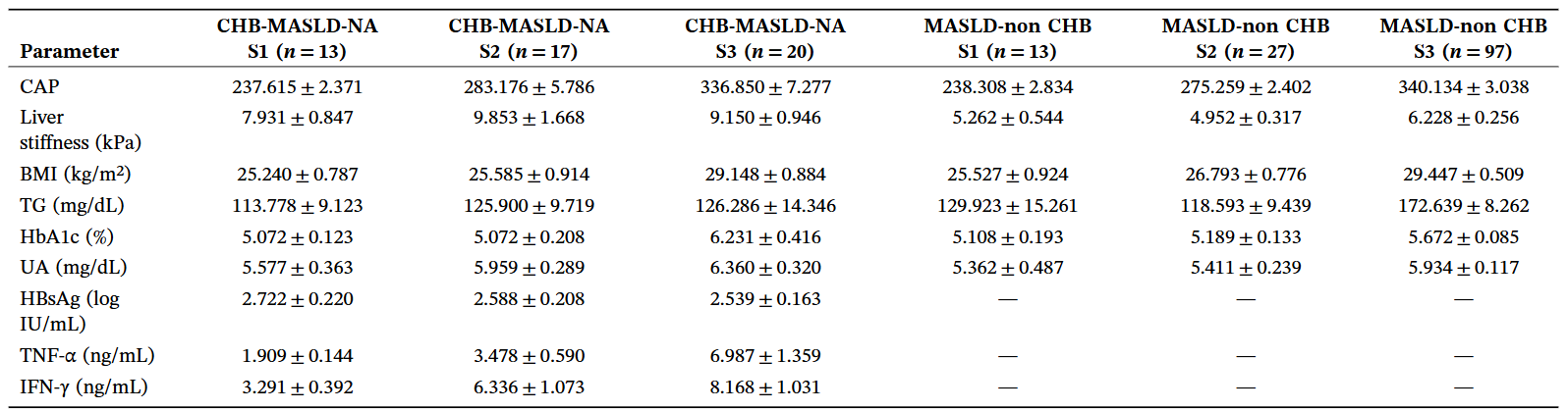 临床队列部分:研究回顾性纳入了201例受试者,其中包含64例接受长期NAs治疗且血清HBV DNA检测不到的慢乙肝患者(其中50例为慢乙肝合并MASLD,14例为单纯慢乙肝),以及137例单纯MASLD对照患者。根据受控衰减参数(CAP),患有MASLD的患者被分为轻度(S1,215-252 dB/m)、中度(S2,252-296 dB/m)及重度(S3,>296 dB/m)脂肪变性亚组。通过瞬时弹性成像技术评估肝脏硬度(LSM),并系统检测了受试者的代谢参数及TNF-α、IFN-γ等核心细胞因子水平,以深度探究MASLD影响肝脏的病理生理机制。