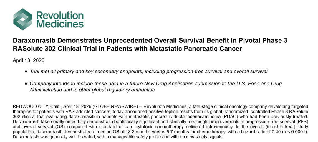 4月13日,Revolution Medicines宣布Daraxonrasib(RMC-6236)治疗胰腺导管癌(PDAC)的III期RASolute 302研究在中期分析中取得了积极结果。
