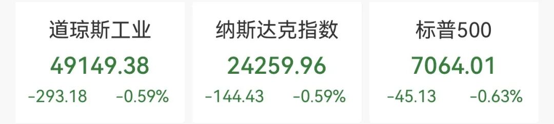 截至收盘,道琼斯工业平均指数跌293.18点,跌幅0.59%,报49149.38点;纳指跌144.43点,跌幅0.59%,报24259.96点;标准普尔500指数跌45.13点,跌幅0.63%,报7064.01点。