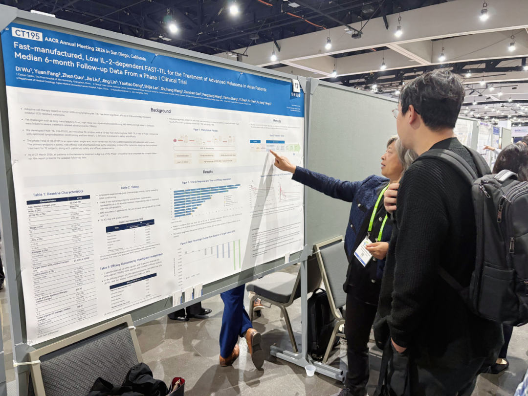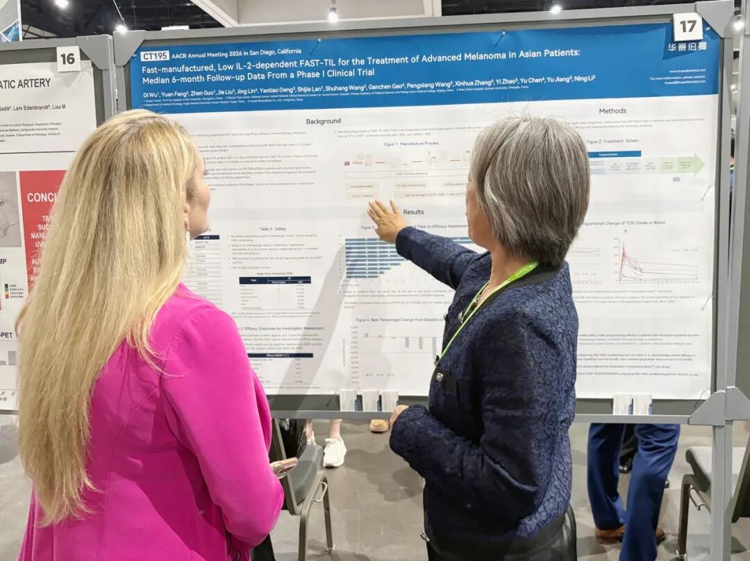 当地时间 2026 年 4 月 17-22 日,全球肿瘤研究领域最具影响力的学术盛会之一——2026 年美国癌症研究协会(AACR)年会在美国圣地亚哥盛大举行。华赛伯曼自主研发的 FAST-TIL(HS-IT101)Ⅰ期临床试验 6 个月随访数据重磅亮相大会,凭借快速制备、低 IL-2 依赖的突破性优势,以及稳定、持久的优异疗效,再次向全球学界展示中国原研 TIL 细胞治疗在晚期黑色素瘤领域的最新临床进展,彰显中国创新力量在实体瘤细胞治疗赛道的硬核实力。