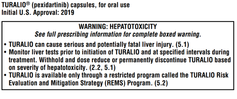 因此,Pexidartinib虽获批准上市,但由于严重肝毒性问题,在美国被加上黑框警告。