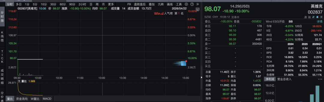 4月22日,英维克(002837)开盘继续跌停,报价98.07元/股。财报发布后,作为A股液冷龙头的英维克已连续两日开盘一字跌停。Wind数据显示,英维克今年以来的股价涨幅已转为下跌8.25%。