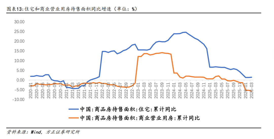 方正证券研报指出,截至3月末,待售3年以下的面积为59012万平方米,同比下降1.8%,降幅较2月末扩大0.2个百分点,说明2022年以来累积的市场新增库存正被逐步消化。分物业类型看,商业营业用房待售面积同比下降5.8%,去化效果最为显著;住宅待售面积虽然同比仍增长1.4%,但环比2月末减少981万平方米,也呈现出明确的改善趋势。