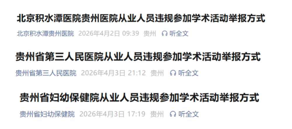 近期,贵州省多家医疗机构、卫健部门发布“医疗卫生机构从业人员违规参加学术活动举报方式”公告,规范医疗学术活动秩序。
