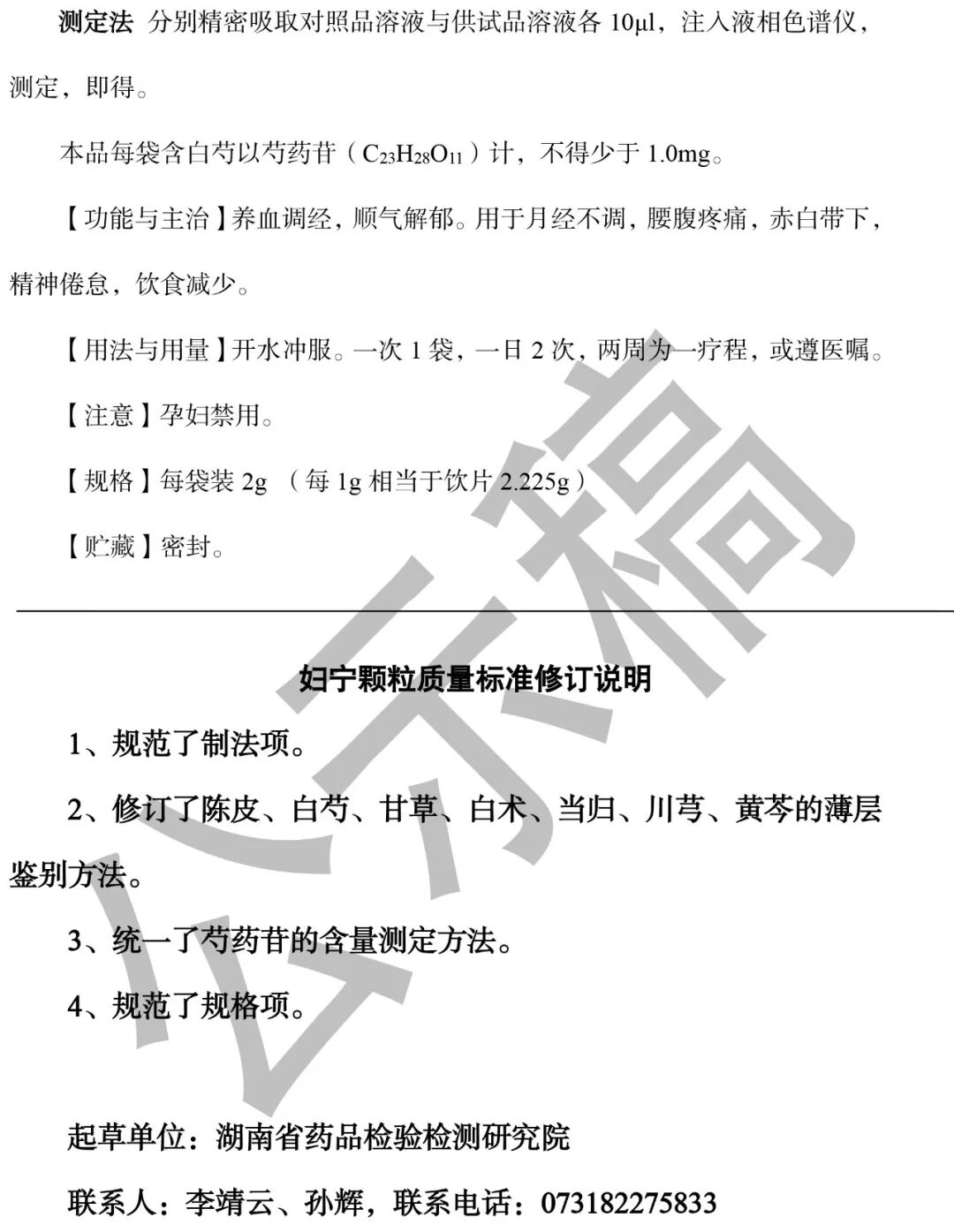 我委拟修订妇宁颗粒国家药品标准,标准编号:WS3-046(Z-011)-2003(Z)-1,WS3-046-(Z-011)-2001(Z),WS3-046(Z-011)-2003Z。为确保标准的科学性、合理性和适用性,现将拟修订的妇宁颗粒国家药品标准公示征求社会各界意见(详见附件)。公示期自发布之日起三个月。请认真研核,若有异议,请及时在线反馈,并附相关说明、实验数据和联系方式。来函需打印后加盖公章,个人来函需打印后本人签名,并邮寄至我委通讯地址。