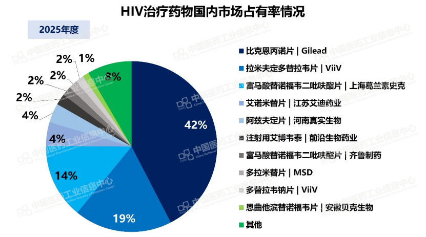 国内市场,根据PDB数据库显示,2025年吉利德国内全渠道销售额占42%,ViiV约占21%,整合酶抑制剂赛道几乎被外资垄断,国产创新药仅有江苏艾迪的艾诺米替片和河南真实生物的阿兹夫定片等零星突围。Idvynso的获批,开辟了一条截然不同的赛道。