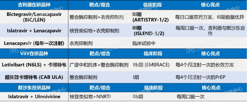 从临床定位来看,Idvynso的差异化竞争力体现在两个维度。第一是机制替代性。随着整合酶抑制剂类药物的广泛使用,耐药性正在缓慢积累,部分患者还面临体重增加、肾功能影响等代谢负担。Idvynso作为非核苷类逆转录酶抑制剂/核苷类似物的双药组合,恰好针对这一临床痛点。相关行业分析师指出,该产品到2033年有望在七大主要市场实现约18亿美元的峰值销售额。与此同时,吉利德的Bictegravir/Lenacapavir(BIC/LEN)双药方案已进入III期临床,ViiV的广谱中和抗体Lotivibart(N6LS)联合卡博特韦也在推进每4个月注射一次的长效方案,双药赛道竞争将持续升温。