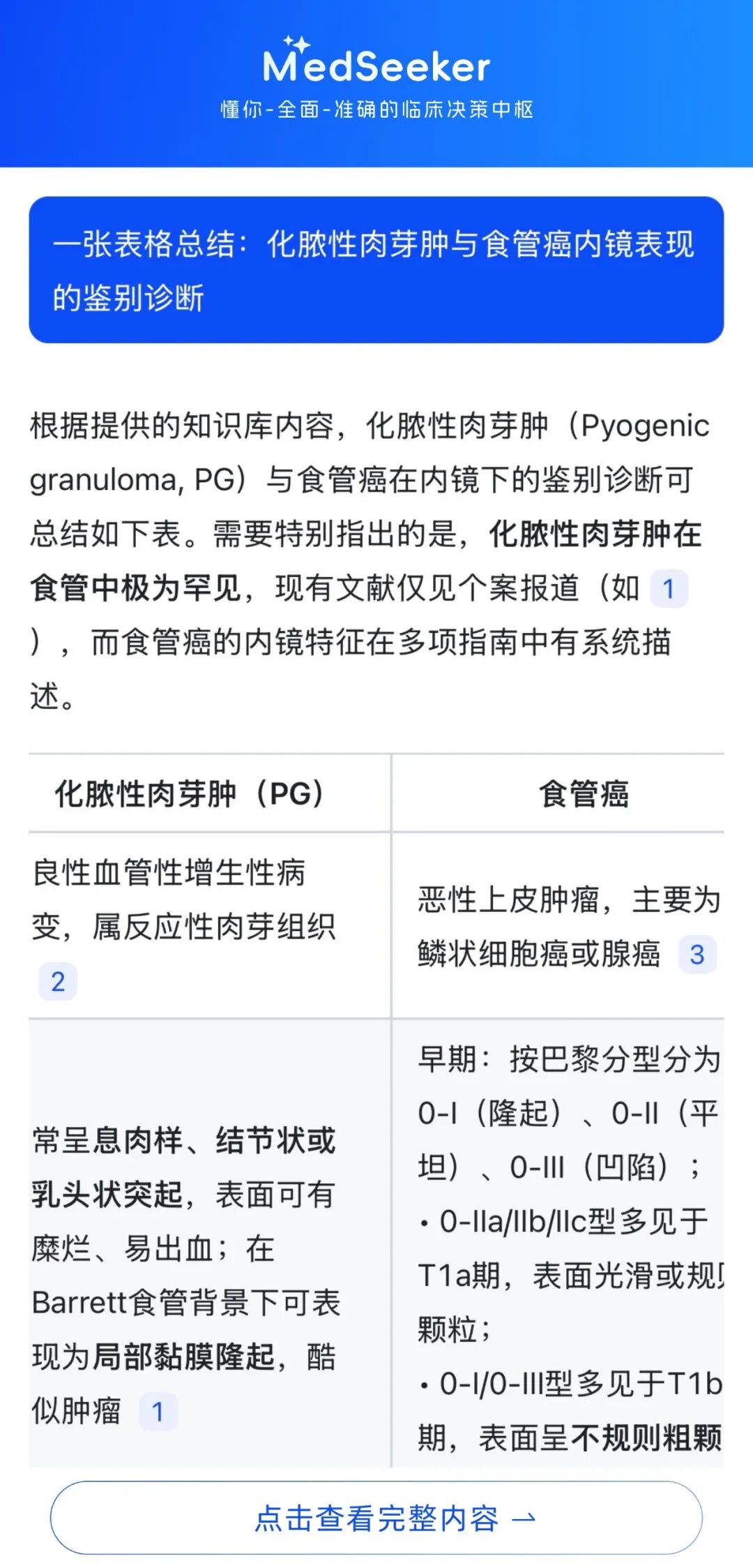 内镜下,化脓性肉芽肿表现为红色息肉样病变,带有白色覆盖物,偶有溃疡形成,易与食管癌混淆。(点击图片了解脓性肉芽肿与食管癌的鉴别诊断要点)。