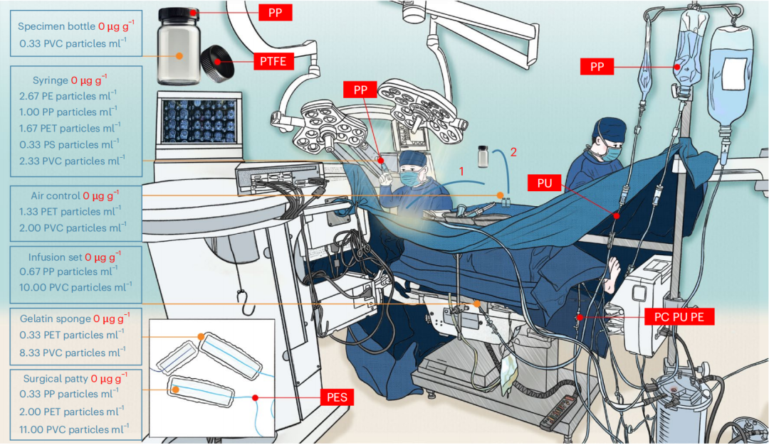 在这项研究中,研究团队还调查了手术过程中可能的塑料污染,他们检测了手术室空气以及注射器、输液管、止血海绵等医疗器材,结果显示,这些医疗器材本身也是微塑料的来源,例如,一次神经外科手术,可能带来数万个微塑料颗粒。这提示了手术过程本身也可能将塑料颗粒引入患者体内。