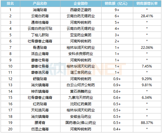 品牌TOP20中,11个销售额超过1亿元,西藏奇正藏药的消痛贴膏、云南白药无锡药业的云南白药膏、河南羚锐制药的通络祛痛膏位居前三。