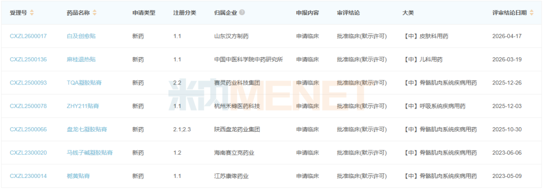 2020年至今,中成药贴膏剂仅健民药业集团的小儿牛黄退热贴膏获批上市,湖南九典制药的椒七止痛凝胶贴膏报产在审,均为中药1类新药。此外,7款中成药贴膏剂中药新药获批临床,其中,山东汉方制药的白及创愈贴、杭州禾橼医药科技的ZHY211贴膏、海南赛立克药业的马钱子碱凝胶贴膏、江苏康缘药业的栀黄贴膏等5款中药1类新药,陕西盘龙药业集团的盘龙七凝胶贴膏、赛灵药业科技集团的TQA凝胶贴膏为中药改良型新药。
