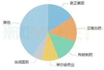 集团TOP20中,奇正集团、云南白药、羚锐制药位居前三,市场份额占比均超过10%,希尔安药业、华润医药分别位列第四、五位次,市场份额占比均超过5%。