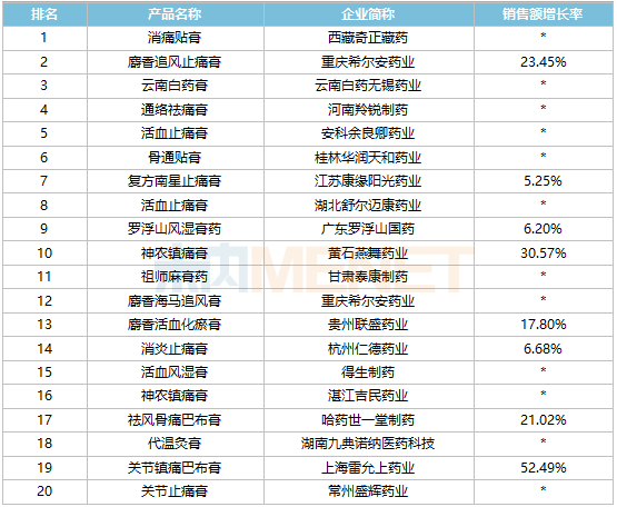 非独家产品中,桂林华润天和药业的麝香壮骨膏、河南羚锐制药的舒腹贴膏、白云山何济公制药的消炎镇痛膏等增速均超过5%。