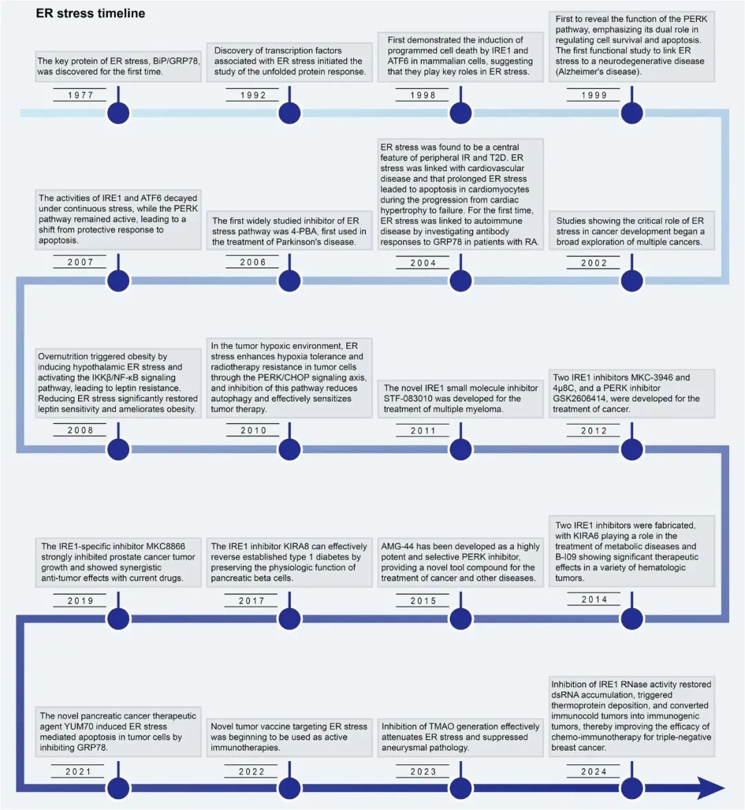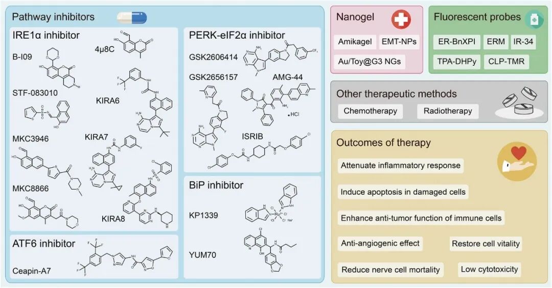 针对IRE1通路的小分子抑制剂已在多发性骨髓瘤、前列腺癌、白血病和糖尿病的临床前或早期临床试验中显示出潜力。针对PERK通路的抑制剂也被开发用于癌症治疗。此外,2022年,一种针对内质网应激的新型肿瘤疫苗已进入临床试验阶段,标志着主动免疫疗法在此领域的应用开端。