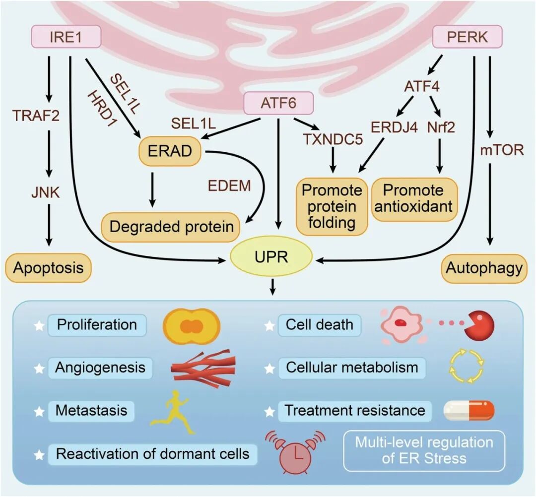 然而,文章指出,UPR是一把双刃剑。适度的激活有助于细胞适应压力、存活下来;但过度或持续的激活,则会将保护性信号转为致死性信号,最终导致细胞凋亡,并驱动疾病进展。这种从适应到凋亡的微妙平衡,在很大程度上决定了疾病的走向。