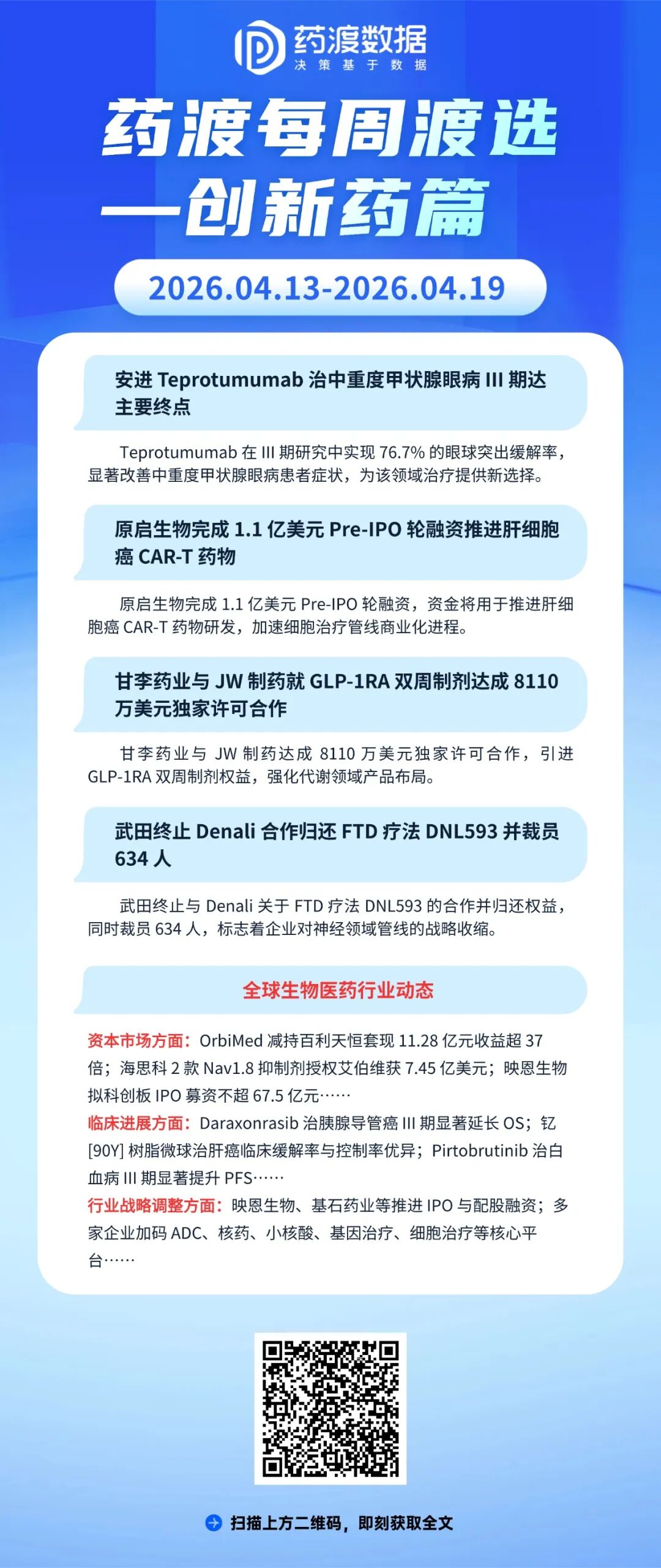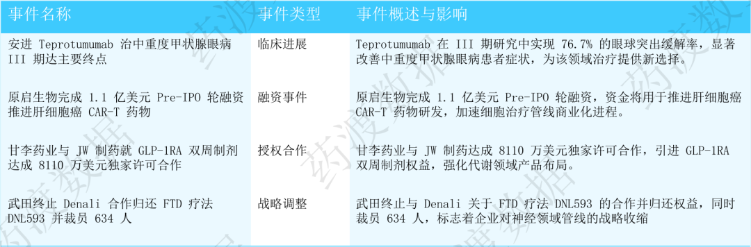 【药渡每周渡选-创新药篇】安进Teprotumumab治疗中重度甲状腺眼病III期达主要终点;原启生物完成1.1亿美元Pre-IPO轮融资……