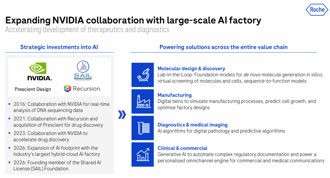 目前,罗氏正在全面扩展与NVIDIA的战略合作伙伴关系,通过建设行业规模最大的混合云AI工厂,加速创新疗法和诊断解决方案的开发,并利用AI技术重塑从研发到商业化的各个环节:分子设计与发现(闭环实验室平台)、生产制造(数字孪生模拟生产流程、预测细胞生长、优化工厂设计方案)、诊断与医学影像(应用于数字病理的AI算法及预测模型)以及临床与商业化(生成式 AI 自动化完成复杂监管文件撰写,并支撑个性化全渠道商业化与医学沟通体系)。