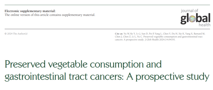 3.Yu W, Ke Y, Lv J, Sun D, Pei P, Yang L, Chen Y, Du H, Xie K, Yang X, Barnard M, Chen J, Chen Z, Li L, Yu C; China Kadoorie Biobank Collaborative Group. Preserved vegetable consumption and gastrointestinal tract cancers: A prospective study. J Glob Health. 2024 Nov 8;14:04191. doi: 10.7189/jogh.14.04191.