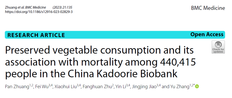 4.Zhuang P, Wu F, Liu X, Zhu F, Li Y, Jiao J, Zhang Y. Preserved vegetable consumption and its association with mortality among 440,415 people in the China Kadoorie Biobank. BMC Med. 2023 Apr 5;21(1):135. doi: 10.1186/s12916-023-02829-3.