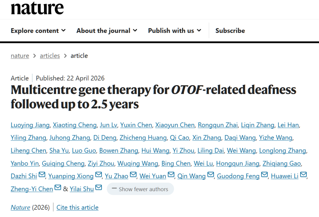 [1]Jiang, L., Cheng, X., Lv, J. et al. Multicentre gene therapy for OTOF-related deafness followed up to 2.5 years. Nature (2026).