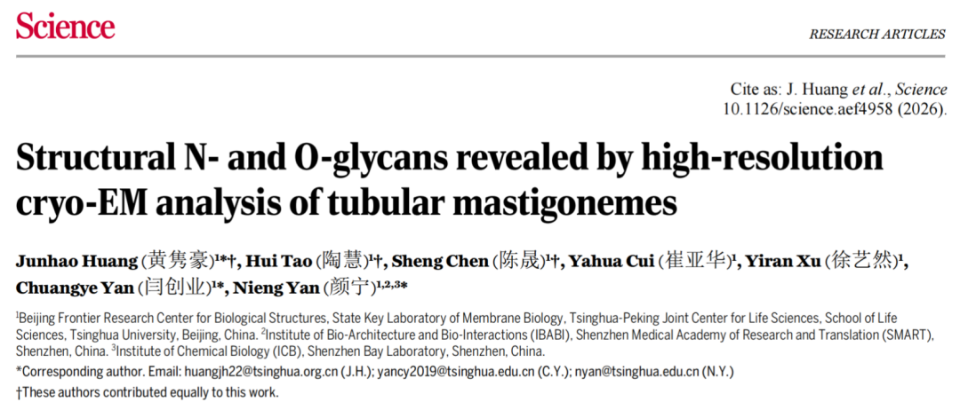 2026 年 4 月 23 日,颜宁、黄隽豪、闫创业等在国际顶尖学术期刊 Science 上发表了题为:Structural N- and O-glycans revealed by high-resolution cryo-EM analysis of tubular mastigonemes 的研究论文。