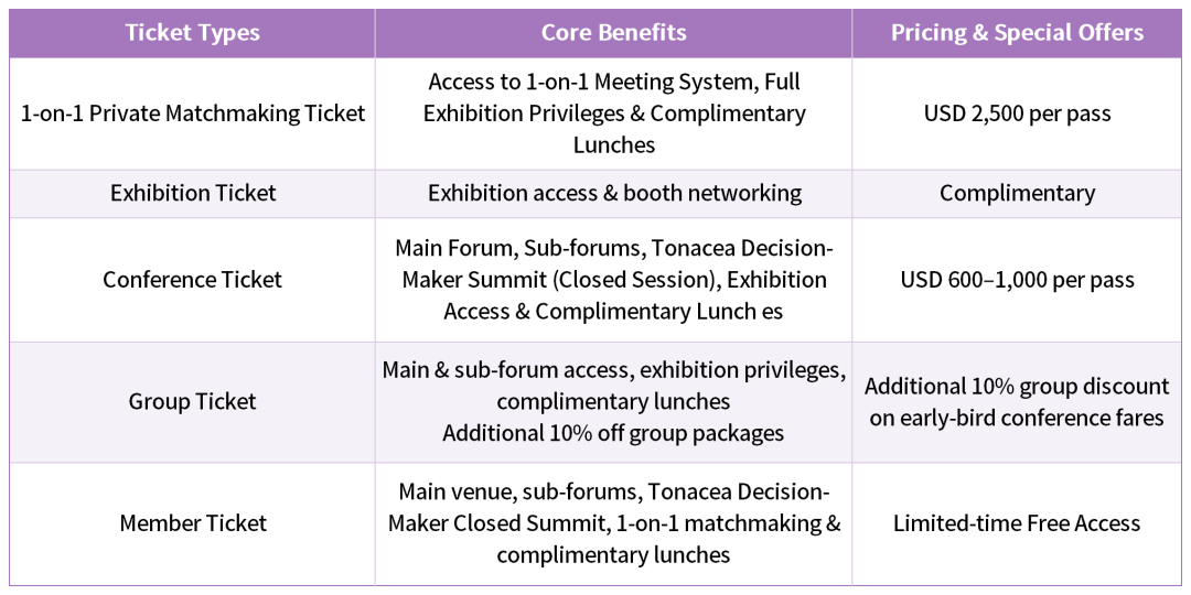 To accommodate diverse requirements, the conference offers five types of tickets covering exhibition access, forum sessions, one-on-one business matchmaking and other participation scenarios. You may choose accordingly based on your personal demands.