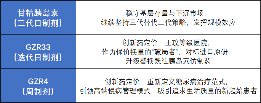 从全球胰岛素市场格局来看,行业正经历深刻的结构性调整。国内市场中,三代甘精胰岛素已进入集采常态化,产品价格趋于透明;而周制剂胰岛素(如甘李药业GZR4)虽尚未明确相关政策导向,但结合其创新属性,未来大概率将与三代基础胰岛素形成市场区隔,主要面向高端与创新治疗需求市场。两者之间的价格与市场定位空白,为GZR33提供了明确的市场切入点,形成了一套立体化的护城河策略: