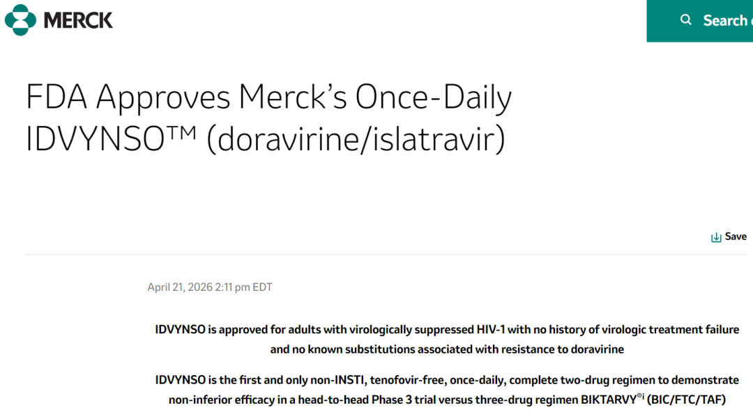 图1. 默沙东口服HIV双药疗法获FDA批准,来源:公司官网