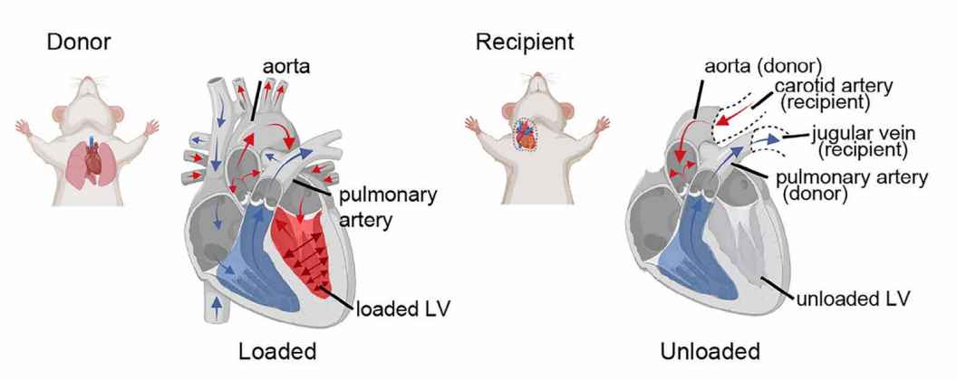 接下来,研究团队构建了两种模型,一种是“异位心脏移植”模型,将供体小鼠心脏移植到受体小鼠的颈部,使其恢复血液灌注但不承受泵血所产生的机械负荷。另一种是可精确控制机械负荷的“工程心脏组织”模型。