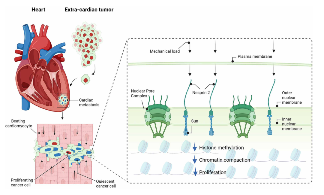 抑制心脏中癌细胞增殖的关键机制:植入心肌的癌细胞会受到心肌细胞收缩以及心脏跳动产生的机械力的影响。Nesprin-2 是感知这些机械力的关键分子,从而导致癌细胞中组蛋白甲基化减少和染色质松散,最终抑制癌细胞增殖。
