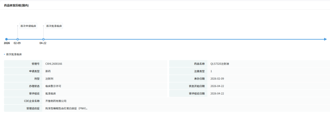 不到一个月内,齐鲁制药接连迎来两项重要临床进展。2026年4月22日,公司自主研发的1类创新药QLS7320注射液获CDE临床试验默示许可,用于治疗阵发性睡眠性血红蛋白尿症(PNH)。而在4月13日,另一款1类新药注射用QLS5212也获批临床,适应症为晚期实体瘤,4月21日进入Ⅰ期临床。