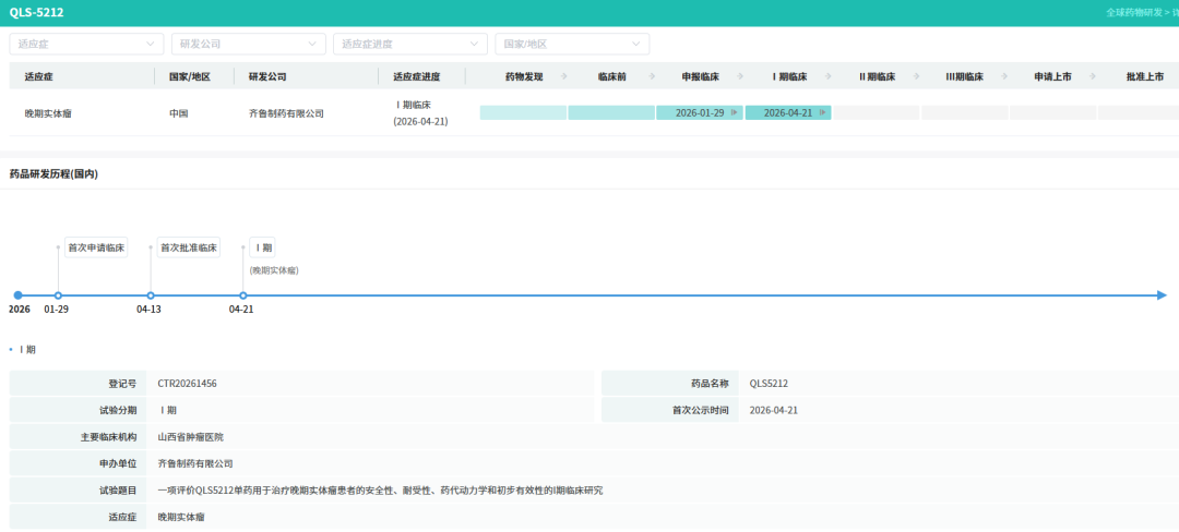 注射用QLS5212是齐鲁制药自主研发的一款抗体偶联药物(ADC),拟用于治疗晚期实体瘤。QLS5212在2026年1月29日首次申请临床,4月13日,首次获批临床,4月21日进入Ⅰ期临床。