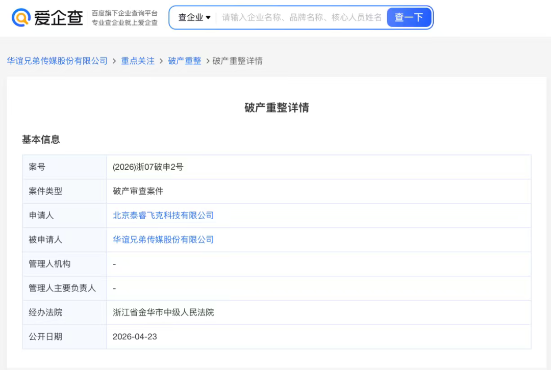 此前,4月15日,华谊兄弟发布公告披露,公司当日收到债权人北京泰睿飞克《告知函》,对方以公司 “不能清偿到期债务且明显缺乏清偿能力,但具备重整价值”为由,已向浙江省金华市中级人民法院申请对公司进行重整及预重整。