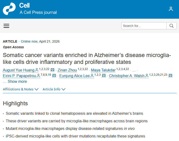 Cell重磅研究!脑内“基因故障”揭示阿尔茨海默病新机制:小胶质细胞体细胞变异或成促炎重要推手