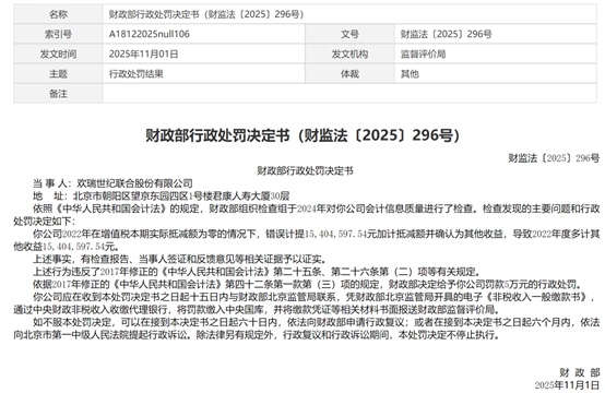 2025年11月1日,财政部连发6道处罚决定书,分别对欢瑞世纪公司、董事长、财务总监,以及年审会计师事务所立信中联,及签字注册会计师均相应作出处罚决定。