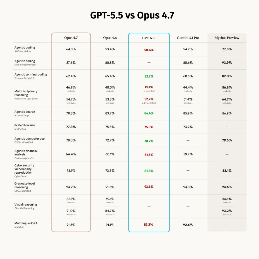 例如,有网友发现,在基准测试榜单上,OpenAI没有呈现的几个数据仍然落后于Opus 4.7。