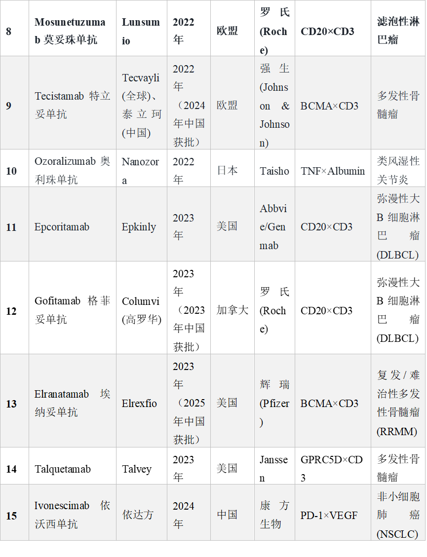 2014年获批,是全球首款上市的双特异性抗体,属于非IgG样结构(BiTE技术)。它同时靶向B细胞表面抗原CD19和T细胞表面CD3,通过“桥接”作用激活T细胞,使其直接杀伤B细胞急性淋巴细胞白血病(ALL)细胞。适用于复发或难治性前体B细胞ALL患者,尤其对微小残留病灶(MRD)阳性患者有显著疗效,能提高完全缓解率和生存率。