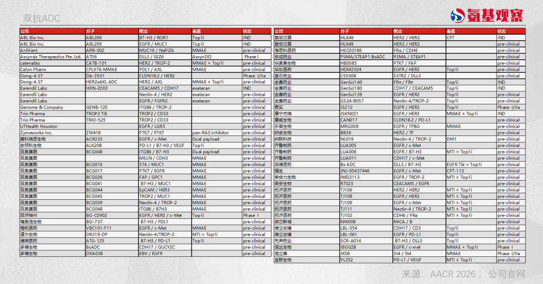 到了今年,无论是数量规模还是靶点、载荷组合的类型上都明显增加。从AACR 2026披露的摘要统计结果来看,双抗ADC与双载荷ADC相关研发已超过100项,其中既包括去年已披露管线的后续临床进展,也包括大量首次公开的早期资产。