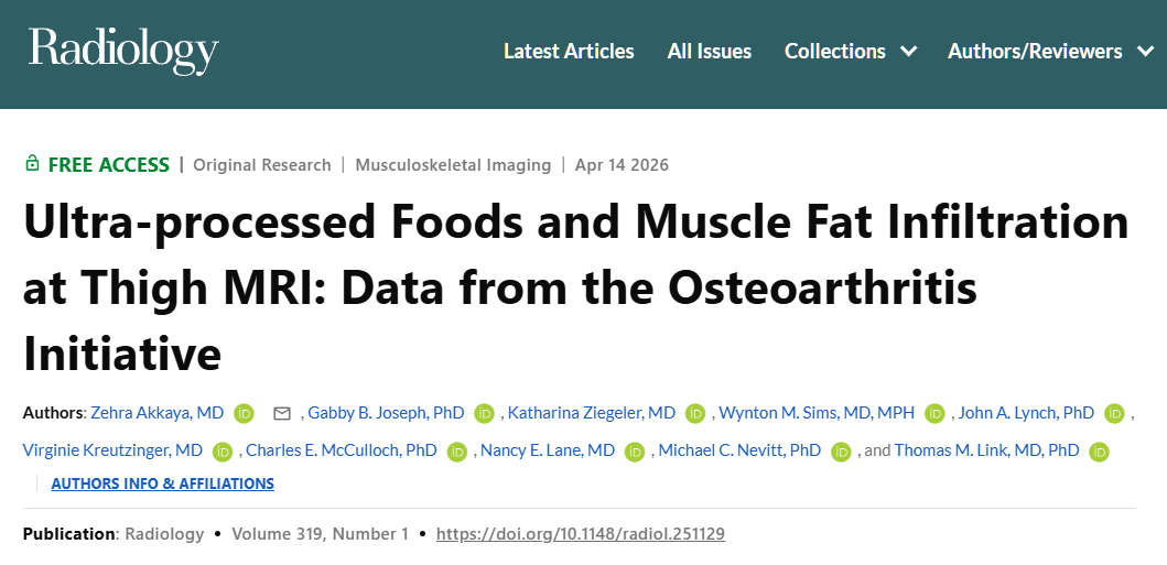 [1]Akkaya Z, Joseph GB, Ziegeler K, et al. Ultra-processed Foods and Muscle Fat Infiltration at Thigh MRI: Data from the Osteoarthritis Initiative. Radiology. 2026;319(1):e251129. doi:10.1148/radiol.251129