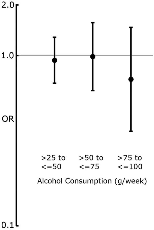- >50-75克/周组:`OR 0.99(95%CI 0.62-1.56)`