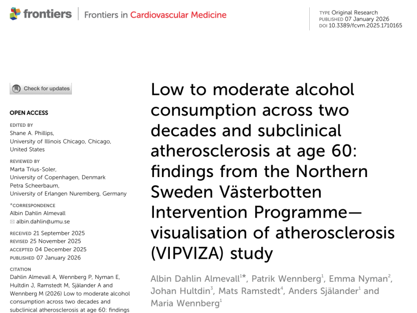 Dahlin Almevall A, Wennberg P, Nyman E, Hultdin J, Ramstedt M, Själander A and Wennberg M (2026) Low to moderate alcohol consumption across two decades and subclinical atherosclerosis at age 60: findings from the Northern Sweden Västerbotten Intervention Programme—visualisation of atherosclerosis (VIPVIZA) study. Front. Cardiovasc. Med. 12:1710165. doi: 10.3389/fcvm.2025.1710165