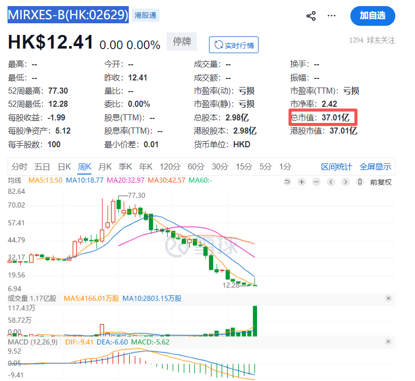 觅瑞基因(MIRXES-B)2025年5月才在港股18A上市,因审计师毕马威发现有约1.48亿人民币的预付款"解释不清",年报无法按期发出,股票直接被停牌,市值从80亿跌到37亿,直接跌出港股通。
