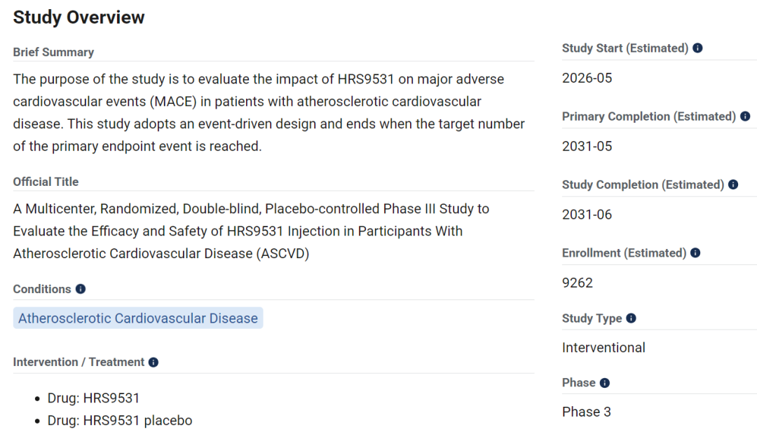 该三期临床只在评估HRS9531对于ASCVD疾病心血管风险(MACE)的影响,计划入组9262例受试者,预计2031年完成。