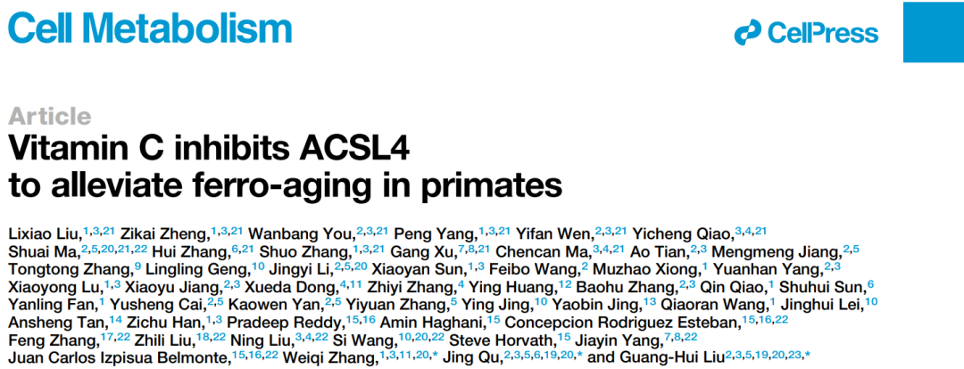 [1]Liu L, Zheng Z, You W, et al. Vitamin C inhibits ACSL4 to alleviate ferro-aging in primates. Cell Metab. 2026;38(4):673-693.e17. doi:10.1016/j.cmet.2026.02.010