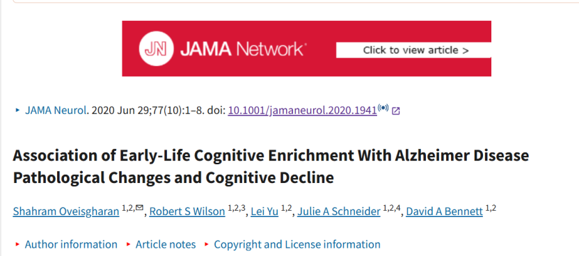[3]Oveisgharan S, Wilson RS, Yu L, Schneider JA, Bennett DA. Association of Early-Life Cognitive Enrichment With Alzheimer Disease Pathological Changes and Cognitive Decline. JAMA Neurol. 2020 Oct 1;77(10):1217-1224. doi: 10.1001/jamaneurol.2020.194 . PMID: 32597941; PMCID: PMC7325069.