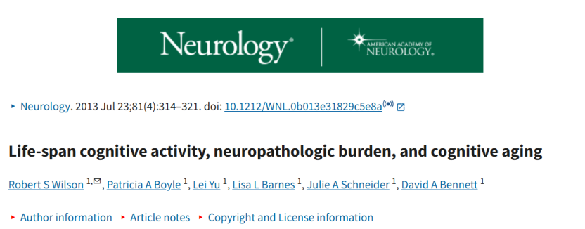 [2]Wilson RS, Boyle PA, Yu L, Barnes LL, Schneider JA, Bennett DA. Life-span cognitive activity, neuropathologic burden, and cognitive aging. Neurology. 2013 Jul 23;81(4):314-21. doi: 10.1212/WNL.0b013e31829c5e8