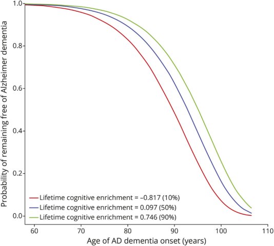 图1:低、中、高终生认知丰富与不患阿尔兹海默症之间的相关性